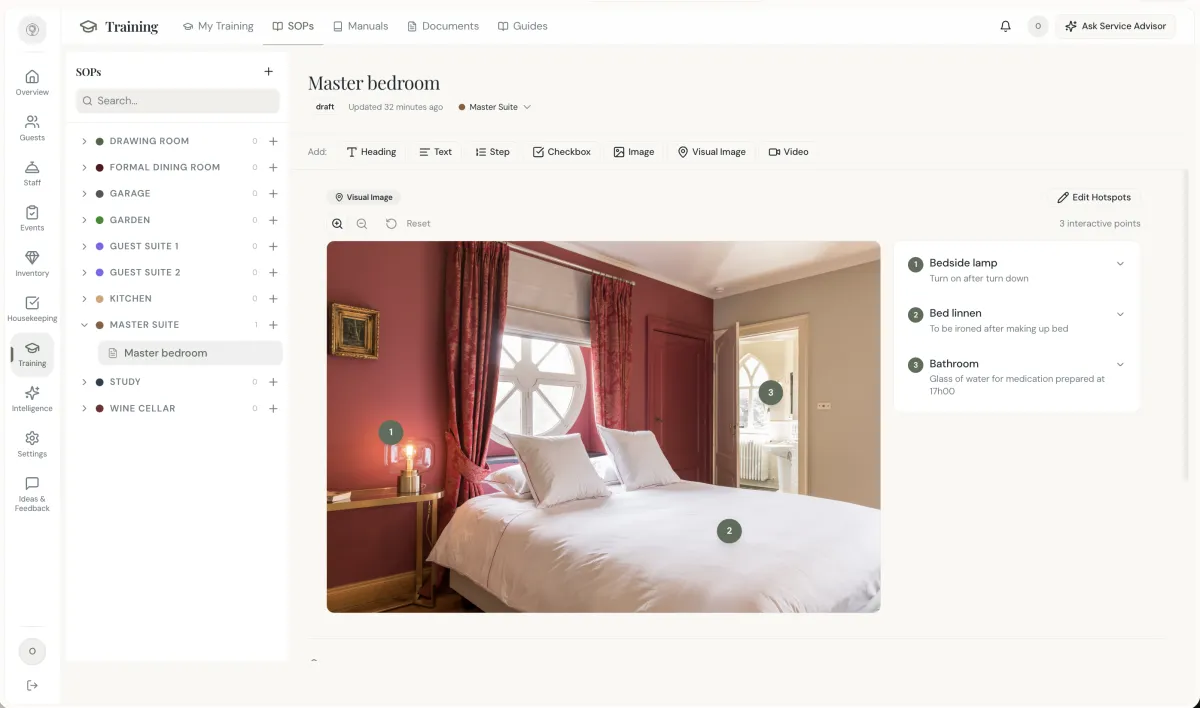 Place numbered instruction markers directly on photos. Staff see exactly where and how to set a table, prepare a room, or follow cleaning protocols — with always-visible hotspot details beside the image.
